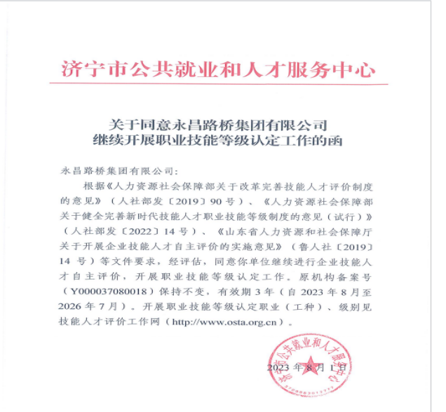 2020年,集團(tuán)公司在全省率先獲得《企業(yè)技能人才自主評(píng)價(jià)資質(zhì)》,隨著近日該資質(zhì)的復(fù)審成功及分子公司不同工種自主評(píng)價(jià)資質(zhì)的獲批,標(biāo)志著永昌集團(tuán)技能人才評(píng)定工作得到了強(qiáng)有力的政策依托,自此公司可自主評(píng)價(jià)挖掘機(jī)司機(jī)、裝載機(jī)司機(jī)、攤鋪機(jī)司機(jī)、壓路機(jī)司機(jī)、推土機(jī)司機(jī)、混凝土操作工、架子工、鋼筋工等工種的技能等級(jí),并頒發(fā)相對(duì)應(yīng)的國(guó)家職業(yè)技能等級(jí)證書(shū)。