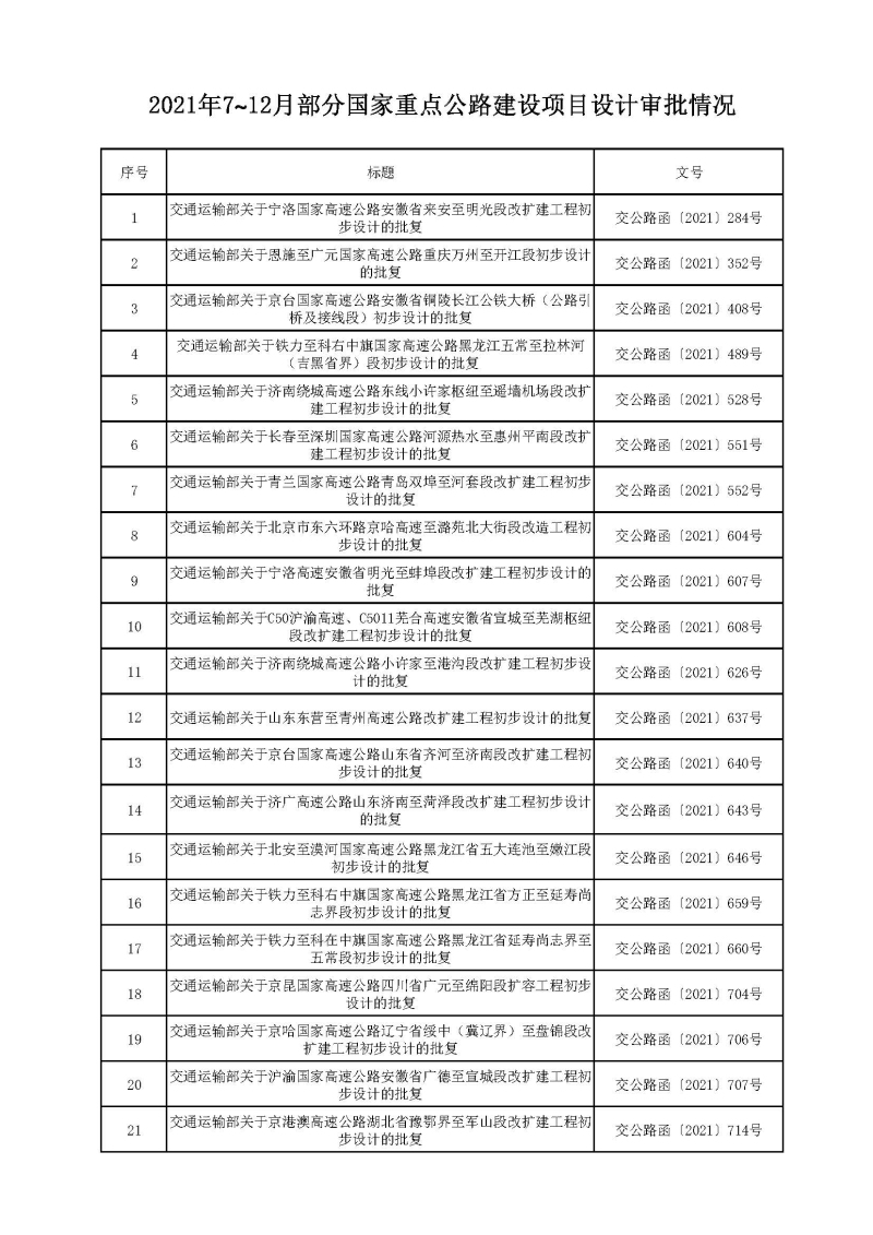 2021年7~12月部分國家重點(diǎn)公路建設(shè)項(xiàng)目設(shè)計(jì)審批情況