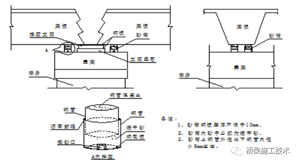 本工程箱梁均為先簡后連續(xù)箱梁,箱梁安裝時均需安放在臨時支座上,待墩頂連續(xù)張拉,壓漿強(qiáng)度達(dá)到設(shè)計強(qiáng)度后,拆除臨時支座,使連續(xù)箱梁支承在永久支座上,臨時支座采用砂筒,砂筒如圖4-3-2-3所示。