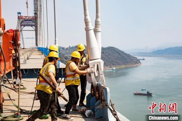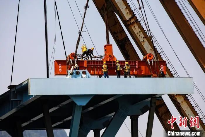 ▲圖為工人正在吊裝郭家沱長(zhǎng)江大橋的最后一塊鋼桁梁。中國(guó)建筑股份有限公司供圖
