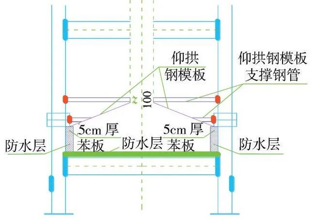 在拱部混凝土施工范圍鋪設(shè)防水層,為確保與中導(dǎo)洞防水的搭接,利用兩層5cm厚苯板對防水層進(jìn)行保護(hù),在中導(dǎo)洞初期支護(hù)破除后去除苯板,實現(xiàn)與出入場線防水層的順接,同時防水層隧道外側(cè)防水層伸出模板超過20cm,便于下步拱墻防水層施工時進(jìn)行搭接(圖11)。