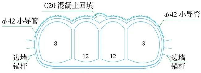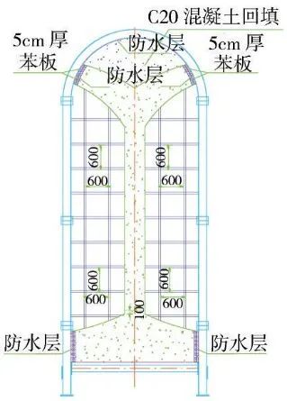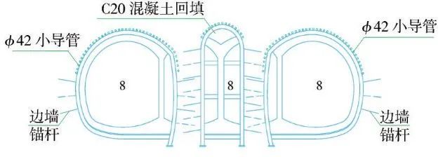 (3)第三步:在上述開挖完成的3個導(dǎo)坑內(nèi)施做二次襯砌,施工順序為:鋪掛防水層—細(xì)石混凝土保護(hù)層—二次襯砌鋼筋施工—二次襯砌混凝土施工,中導(dǎo)洞二次襯砌施工完畢后在其拱部回填C20混凝土(圖3)。