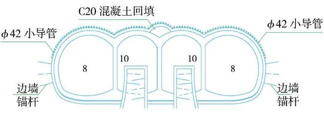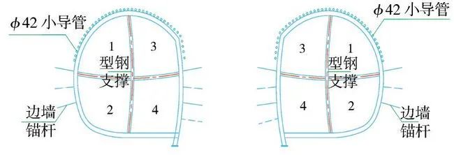 (2)第二步:利用上下導(dǎo)洞法(或臺階法)施做中導(dǎo)坑,同時施做型鋼+掛網(wǎng)+錨噴初期支護(hù),施工前先進(jìn)行拱部?42小導(dǎo)管注漿超前支護(hù)(圖2)。