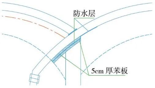 為確保與中導(dǎo)洞防水與出入場線防水的搭接,利用兩層5cm厚苯板對防水層進(jìn)行保護(hù),在中導(dǎo)洞初期支護(hù)破除后去除苯板,實現(xiàn)與出入場線防水層的順接。