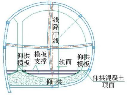 在防水保護(hù)層、仰拱鋼筋施工完成后進(jìn)行中導(dǎo)洞仰拱混凝土施工,中導(dǎo)洞仰拱每循環(huán)施工長度為20~30m(圖14)。