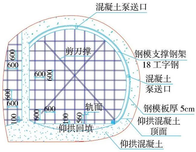 根據(jù)設(shè)計,軌面以下56cm采用C20混凝土進(jìn)行回填,為便于拱墻襯砌支架搭設(shè),在仰拱混凝土強度達(dá)到2.5MPa時進(jìn)行仰拱回填施工,回填混凝土具備強度后在回填頂面加設(shè)工字鋼或鋼板,使豎撐和回填混凝土緊密接觸,確保初期支護(hù)穩(wěn)定(圖10)。