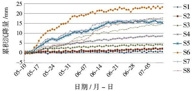 為了掌握圍巖的穩(wěn)定性和支護(hù)結(jié)構(gòu)的受力狀態(tài),分析區(qū)域性施工特征,及時發(fā)現(xiàn)不穩(wěn)定因素,驗證設(shè)計并指導(dǎo)施工,必須加強施工監(jiān)測。監(jiān)測的重點主要為地表沉降、拱頂下沉以及洞身收斂,其次為結(jié)構(gòu)及圍巖應(yīng)力的測量。由于四聯(lián)拱隧道施工共進(jìn)行17次分步開挖,對土體產(chǎn)生多次擾動和累計沉降,因此地表沉降量的監(jiān)測和控制是控制施工安全的最核心內(nèi)容和最關(guān)鍵的重要措施。因篇幅所限,僅對地表沉降過程和結(jié)果作簡要敘述。