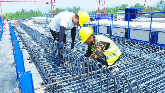 在預(yù)制箱梁模板上,工人們嚴(yán)格按照設(shè)計(jì)要求和施工規(guī)范進(jìn)行鋼筋綁扎等工作,保證預(yù)制箱梁澆筑成功。