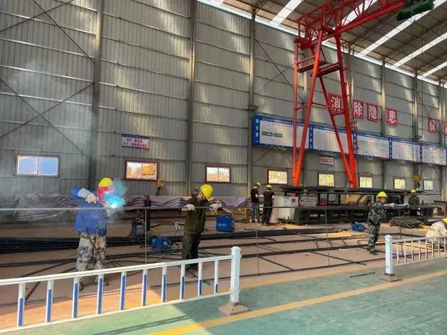 在雄信高速預(yù)制梁鋼筋加工廠,工人們忙著焊接鋼筋。