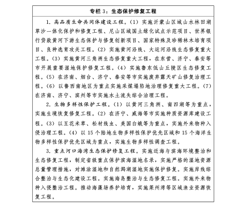 2.提升生態(tài)系統(tǒng)功能與品質(zhì)。強化對黃河三角洲和黃河重要干支流的自然保護(hù)與功能修復(fù),統(tǒng)籌實施黃河三角洲濕地與生物多樣性、沂蒙山區(qū)域山水林田湖草沙等生態(tài)修復(fù)工程。堅持自然恢復(fù)為主,以黃河三角洲、南四湖、沿海等區(qū)域重要濕地為重點,修復(fù)破碎化嚴(yán)重、功能退化的自然濕地。扎實開展科學(xué)綠化試點示范省建設(shè),推進(jìn)沂蒙山、尼山、黃河下游等區(qū)域重點工程項目,推進(jìn)國家特殊及珍稀林木培育和良種選育攻關(guān),持續(xù)開展森林生態(tài)系統(tǒng)保護(hù)與修復(fù)。加強山體地質(zhì)環(huán)境綜合治理,對破損山體、露天采場、廢棄礦井和采煤塌陷地等開展環(huán)境綜合治理與生態(tài)修復(fù),持續(xù)推進(jìn)綠色礦山建設(shè)工作,開展黃河流域礦區(qū)污染治理和生態(tài)修復(fù)試點示范。