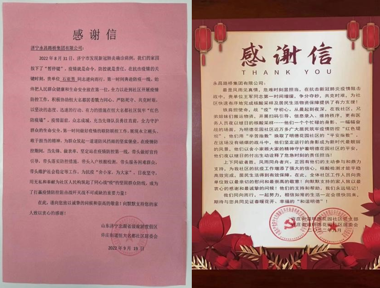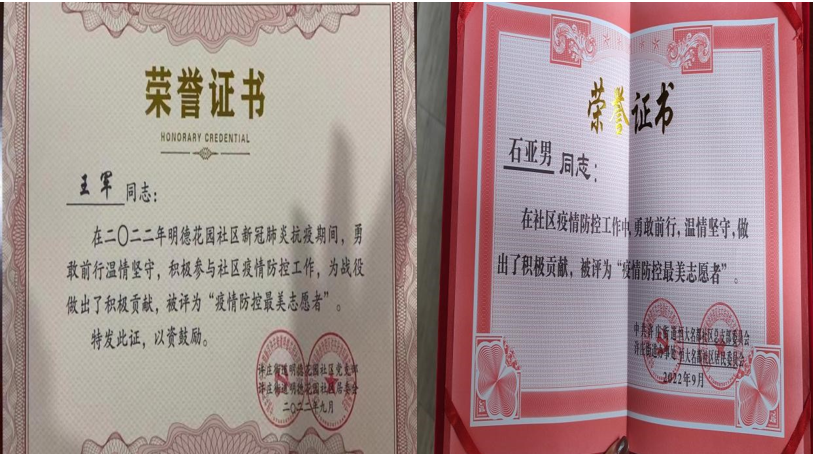 疫情得到有效控制后,集團總部收到了各個社區(qū)發(fā)來的感謝信和獎狀,信中對我公司員工在社區(qū)疫情防控中做出的突出貢獻提出書面表揚。