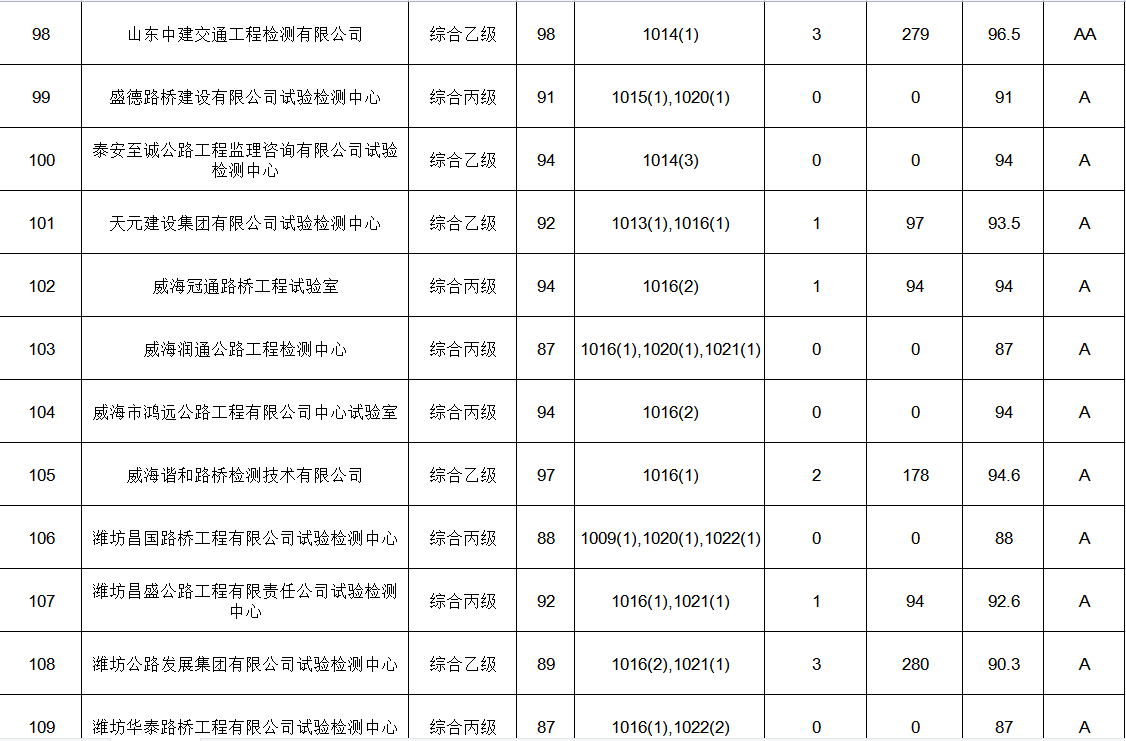本次信用評價涉及2021年度我省正常開展公路水運工程試驗檢測業(yè)務(wù)的檢測機構(gòu)125家,其中獲得AA級的有36家,占比28.8%,山東中建交通工程檢測有限公司是濟寧市唯一一家獲此評價的檢測企業(yè)。