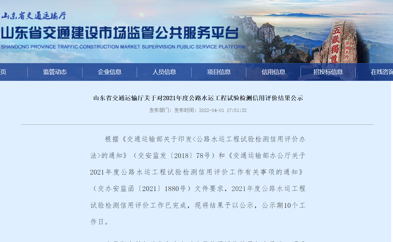 近日山東省交通運輸廳發(fā)布《山東省交通運輸廳關(guān)于2021年度公路水運工程試驗檢測信用評價結(jié)果公示》,山東中建交通工程檢測有限公司獲評2021年度山東省公路水運工程試驗檢測信用評價最高等級AA級。