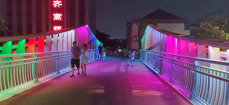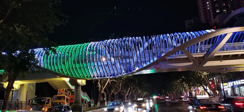 兩座天橋的投入使用實現(xiàn)了公園、體育館與周邊居民區(qū)的交相連接,滿足了城市主干道路的通行速度和以人為本的交通需求,又提高了人文關懷及觀賞性。天橋的景觀亮化工程,在炎炎夏日打造出絢麗多彩的都市分離式交通效果,為市民的夜生活增添一道亮麗的風景線。