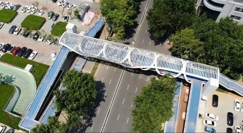 兩座天橋設計均為鋼結構裝配式連續(xù)梁橋均配備了步行梯、垂直電梯和非機動車坡道,使鍛煉、游玩的行人和過往車輛各行其道。