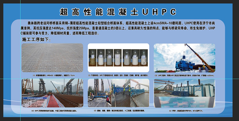 奧體路跨老運(yùn)河橋主橋采用 74m 下承式鋼結(jié)構(gòu)拱橋,橋面采用鋼-薄層超高性能混凝土輕型組合橋面體系,在濟(jì)寧橋梁建設(shè)中屬于首例。施工中還采用了鋼結(jié)構(gòu)高效焊接技術(shù)、高強(qiáng)鋼筋應(yīng)用技術(shù)、高強(qiáng)鋼筋直螺紋連接技術(shù)、預(yù)應(yīng)力技術(shù)、索結(jié)構(gòu)應(yīng)用技術(shù)、施工揚(yáng)塵控制技術(shù)、透水混凝土技術(shù)等國(guó)家推薦的十項(xiàng)新技術(shù)。