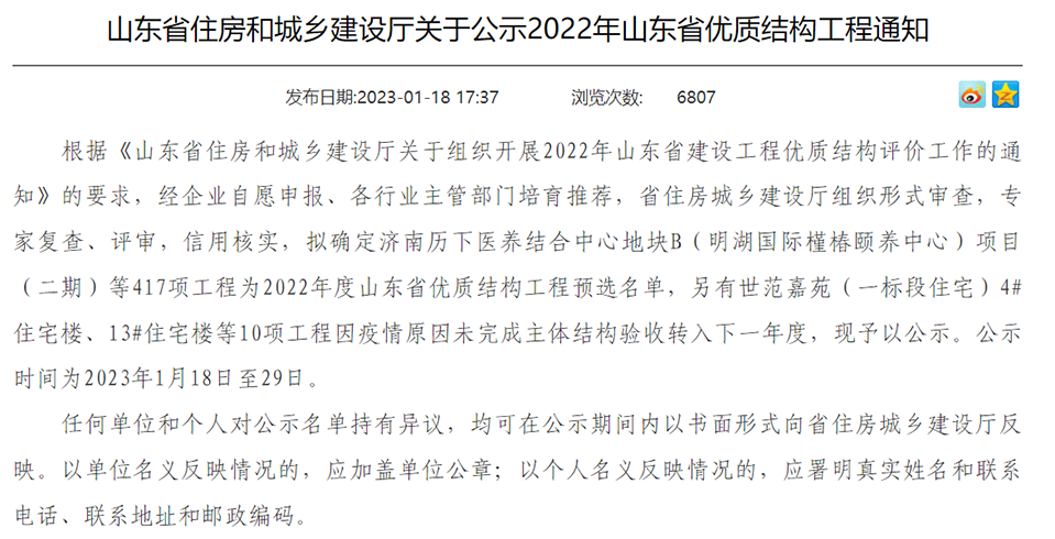 據(jù)悉,該評選活動根據(jù)《山東省住房和城鄉(xiāng)建設(shè)廳關(guān)于組織開展2022年山東省建設(shè)工程優(yōu)質(zhì)結(jié)構(gòu)評價工作的通知》的要求開展,擬確定濟(jì)南歷下醫(yī)養(yǎng)結(jié)合中心地塊B( 明湖國際懂棒頤養(yǎng)中心) 項(xiàng)目(二期)等417項(xiàng)工程為2022年度山東省優(yōu)質(zhì)結(jié)構(gòu)工程預(yù)選名單,公示時間為2023年1月18日至29日,現(xiàn)已公示完畢。濟(jì)寧市獲得此榮譽(yù)稱號的市政工程為3例。