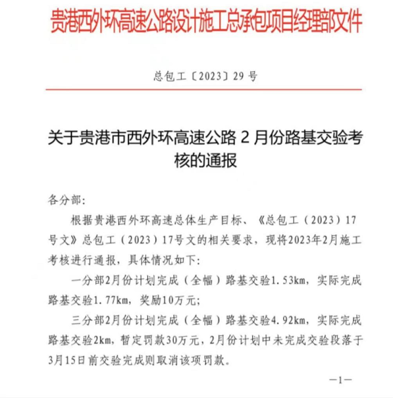 近日,由我公司參建的貴港西外環(huán)高速公路項(xiàng)目K1-K4等四段1.77公里路基順利交驗(yàn),超額完成計(jì)劃指標(biāo),獲得總承包項(xiàng)目經(jīng)理部通報(bào)嘉獎(jiǎng)和交驗(yàn)考核獎(jiǎng)金10萬元獎(jiǎng)勵(lì)。