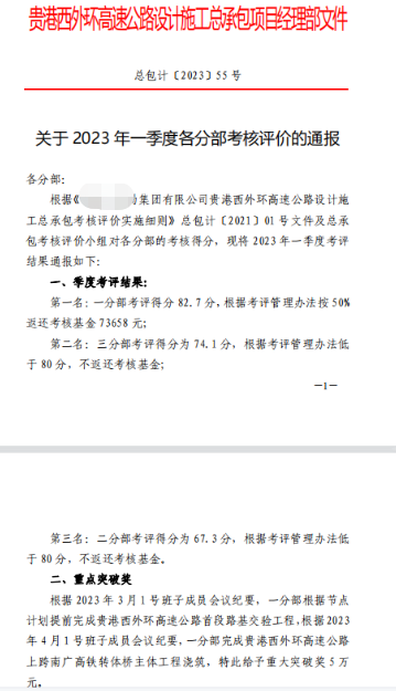 好的過程帶來好的結(jié)果。近日,貴港西外環(huán)項(xiàng)目部收到總包單位考核評(píng)價(jià)通報(bào)文件,我項(xiàng)目部在一季度考評(píng)評(píng)比中獲得第一名佳績,并獲得考核基金7.36萬元及重大突破獎(jiǎng)金5萬元。