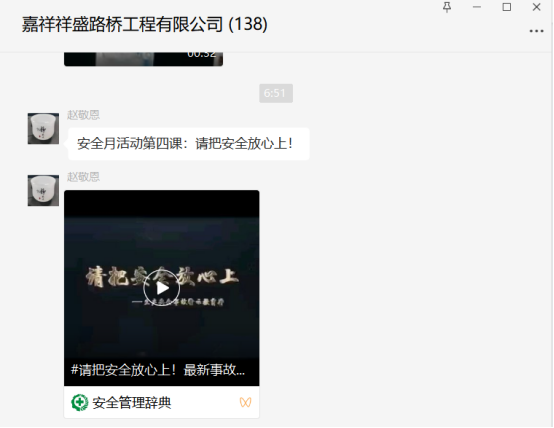 項(xiàng)目部通過微信業(yè)務(wù)群,開辟了“安全寄語(yǔ)”、“圖解隱患”、“活動(dòng)畫冊(cè)”、“看似安全,實(shí)則隱患”、“安全月公開課”等專欄,緊扣安全主題,每日一期,淺顯易懂。比如“安全寄語(yǔ)”,每天發(fā)布一條安全諺語(yǔ),以示警示;“圖解隱患”,以現(xiàn)場(chǎng)發(fā)現(xiàn)的事故隱患為例,制作成圖片,載明隱患描述、生成原因、危害程度、治理措施等;“活動(dòng)畫冊(cè)”,則用一些動(dòng)漫圖片,普及一些安全小常識(shí)。