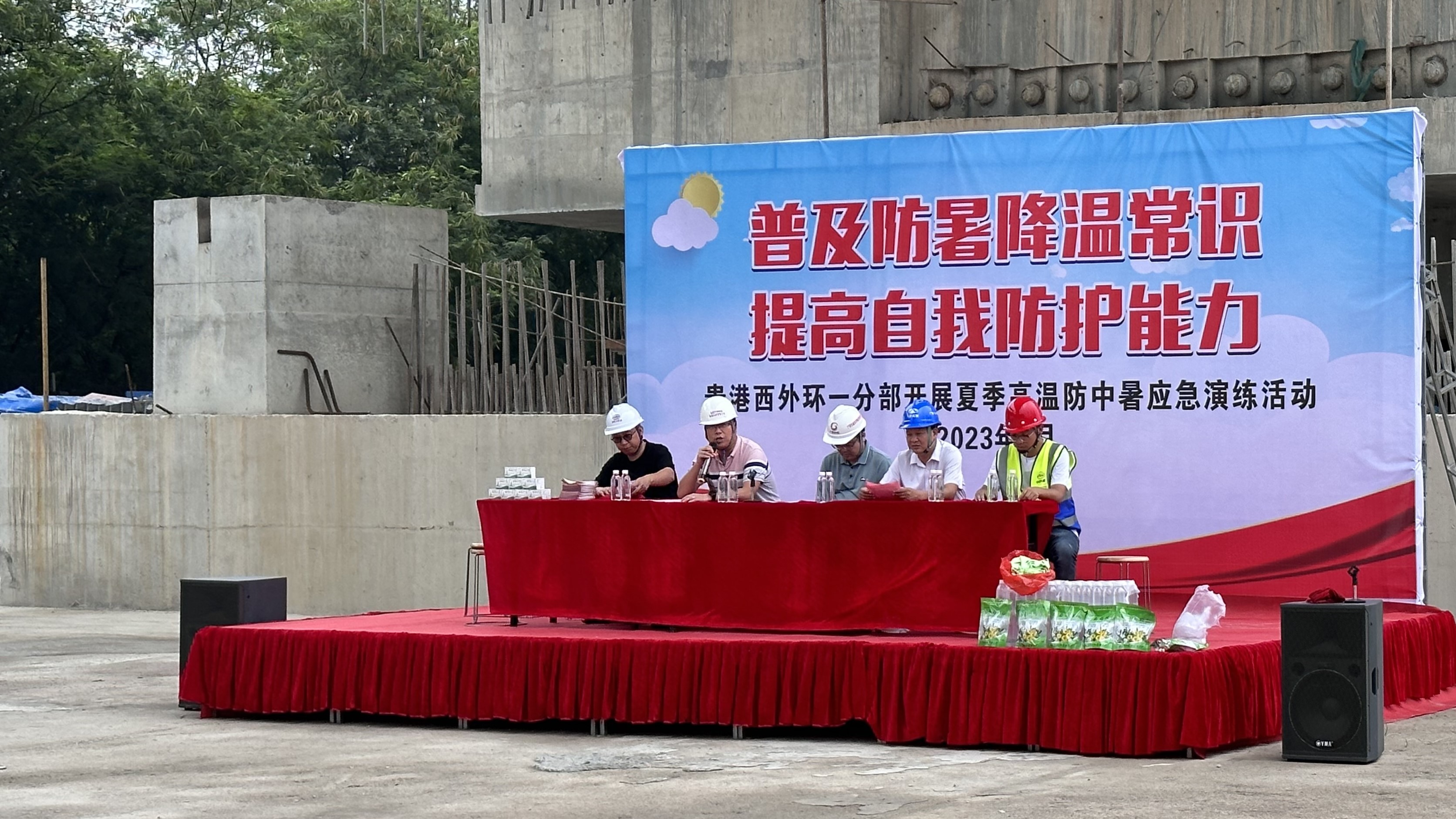 “緊急情況,轉(zhuǎn)體橋施工現(xiàn)場有工人中暑暈倒了。”一句急促而焦灼的報告聲,拉開了貴港西外環(huán)項目部2023年“安全生產(chǎn)月”中暑事故應(yīng)急救援演練活動的帷幕。